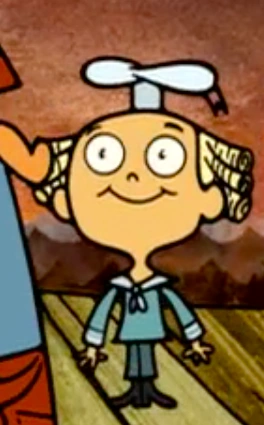 Jackflap wears a white sailor hat, has yellow hair, wears a blue shirt and pants, and black shoes.