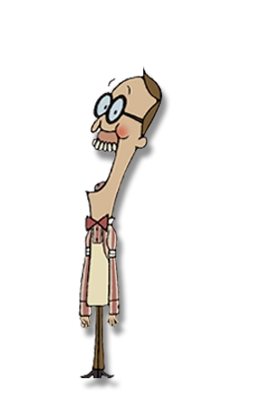 Peppermint Larry has a thin body with a long head, he also has brown hair and has large very visable gums. He wears a white dress shirts with red stripes, a white apron, brown pants with black shoes and black round glasses. He is 6 feet tall.